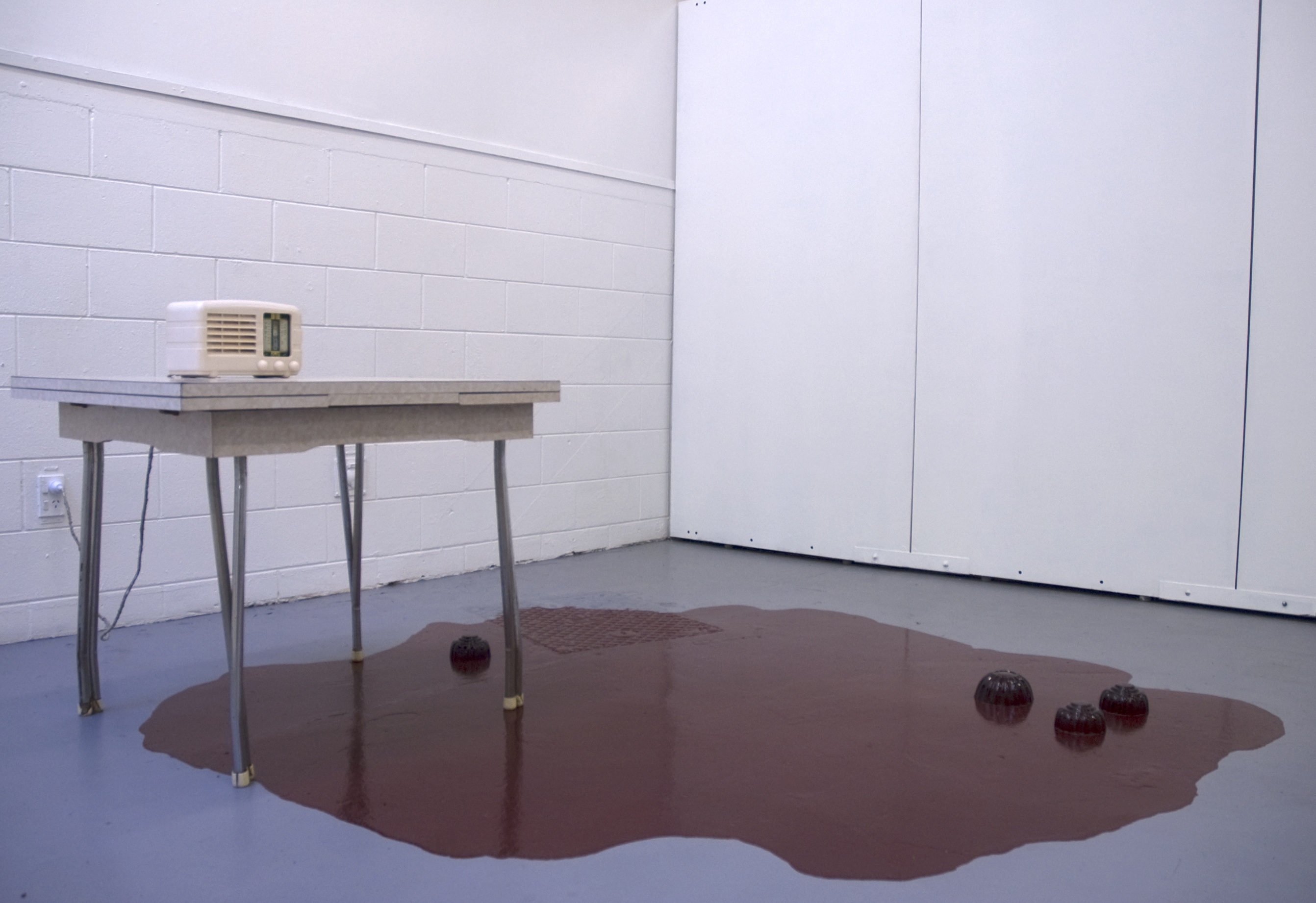 Marjorie took the tea towel from where is hung on the rail at the end of the bench holding it over the sink, turning the tap. As the water soaked into the fabric it darkened and intensified the colours revealing glimpses of floral species native to the South Pacific. Marjorie extracted from the box the objects that had been so carefully hidden; jelly molds. Running the cloth over their surface she removed the dust and debris. Each vessel she prepared promised to mold crystalline forms with peaks and curves becoming of the glistening substance. Lined along the bench and tabletop they awaited the sweet hot jelly.